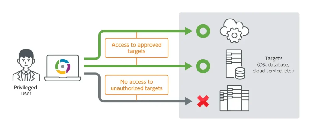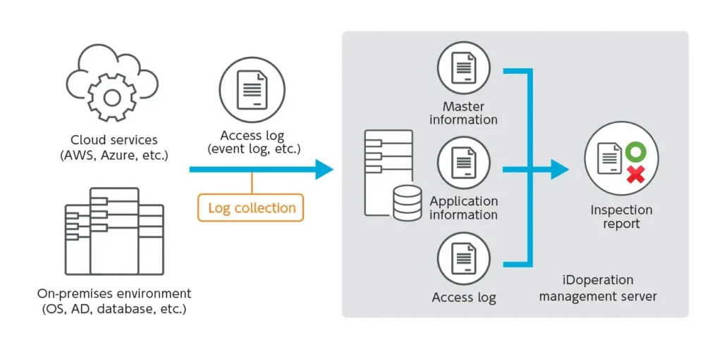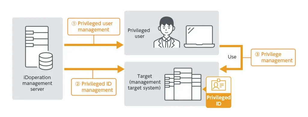 iDoperation captures privileged IDs from a management target system (hereinafter referred to as the target) and visualizes privileged IDs in the organization. The administrator can visualize privileged IDs, privileged users and privileged access usage rights by registering privileged users and setting permissions. iDoperation also automates administrator tasks such as periodic password changes and account matching. Administrators can understand management status simply by checking the outcomes of password changes or account inspection.